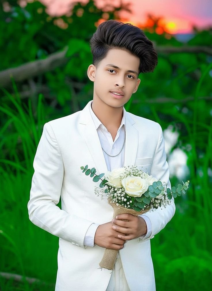 Editing Prompt: "Outdoor portrait at golden hour, subject wearing a crisp white suit, holding a bouquet of white roses and eucalyptus, soft warm lighting, lush green out-of-focus background, hint of a colorful sunset sky, slight glow effect."