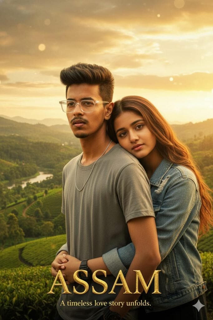 No change face 24+ Transform the 21 year old thin and skinny half body boy the uploaded photo into cinematic romantic Bollywood movie poster name'ASSAM'featuring a young couple standing closely together.and a wearing a casual grey shirt and a necklace. The Indian 16 year real girl has long wavy brown hair, subtle makeup, and wears a denim jacket as she gently hugs the boy from behind, resting her head on his shoulder with a soft, emotional expression.