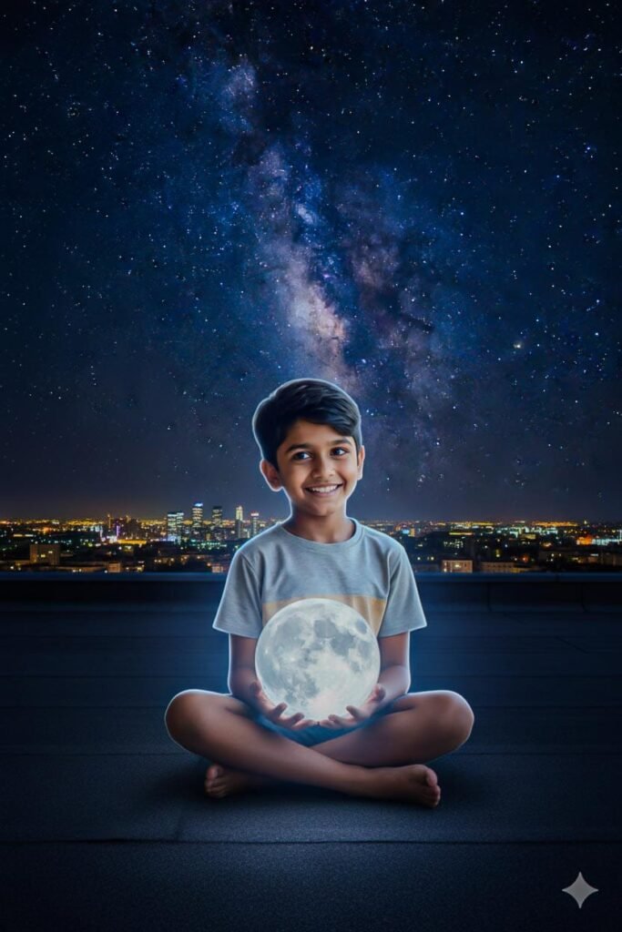 A stunning photo edit. A young man sitting cross-legged on a dark rooftop with a clear, realistic night sky and a visible Milky Way above. He is holding a large, brightly glowing full moon in his hands. The light from the moon casts a soft, dramatic glow on his face and clothing (rim light). In the distant background, a sharp city skyline with twinkling lights is visible. The man’s face and original features must be preserved exactly as in the input image. Realistic cinematic lighting, highly detailed, professional photo editing, deep blue and dark tones, 8K, shot on a Canon R5