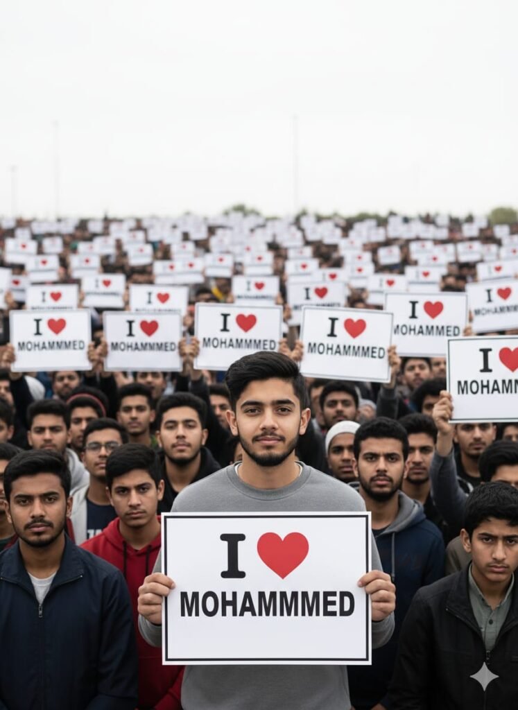Edit the original image to show the person in front of a massive peaceful protest crowd of Muslim brothers, all holding signs reading “I ❤️ love MOHAMMED”. The person should be confidently holding the same sign at chest or head height. Keep the person’s facial features exactly the same, with no AI distortions. The crowd should look realistic, diverse, and emotionally expressive — showing unity, faith, and peace. Lighting and composition must match the original photo’s style to maintain realism.